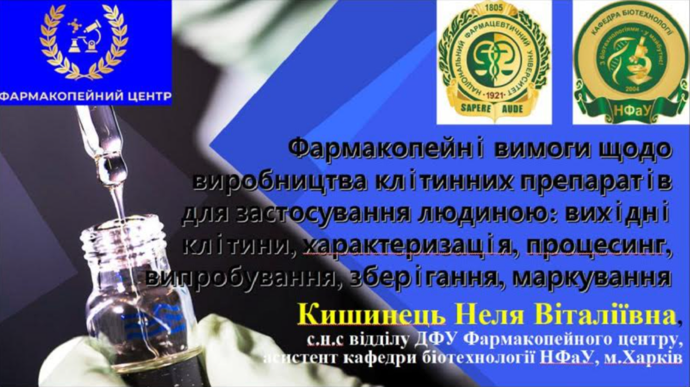 Шановні колеги, раді поділитись новиною та запросити на науковий семінар «Фармакопейні вимоги щодо виробництва клітинних препаратів для застосування людиною: вихідні клітини, характеризація, процесинг, випробування, зберігання, маркування»
