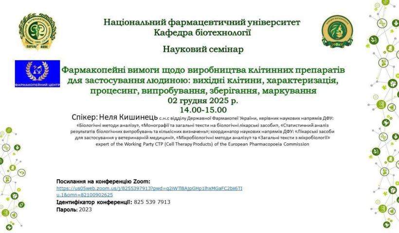 2 грудня 2025 року відбудеться науковий семінар «Фармакопейні вимоги щодо виробництва клітинних препаратів для застосування людиною: вихідні клітини, характеризація, процесинг, випробування, зберігання, маркування»